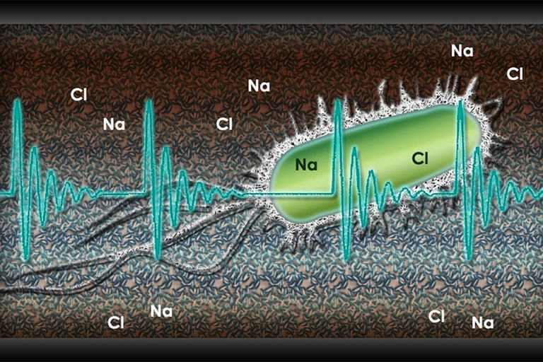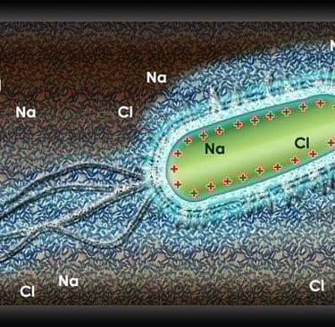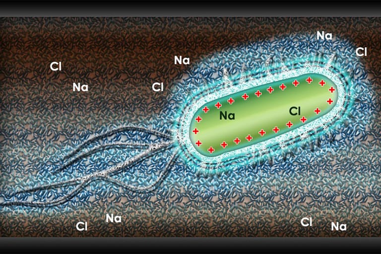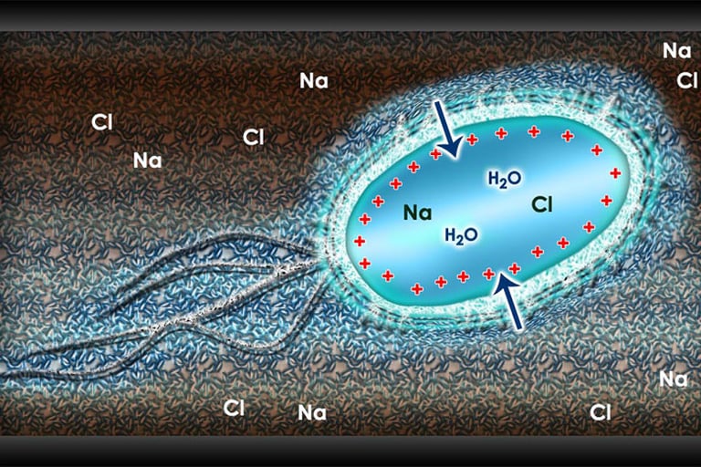 A bacterium passing through the HydroFLOW unit becomes charged.