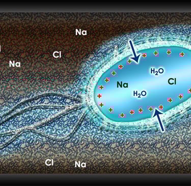 Bacteria and/or algae that pass through the water conditioner's ring of ferrites become charged by the Hydropath signal. This charge forms a hydration layer of pure water around the cell. Osmosis forces water into the bacteria and/or algae, creating osmotic pressure, which ruptures the cell membrane and causes the cell to perish.
