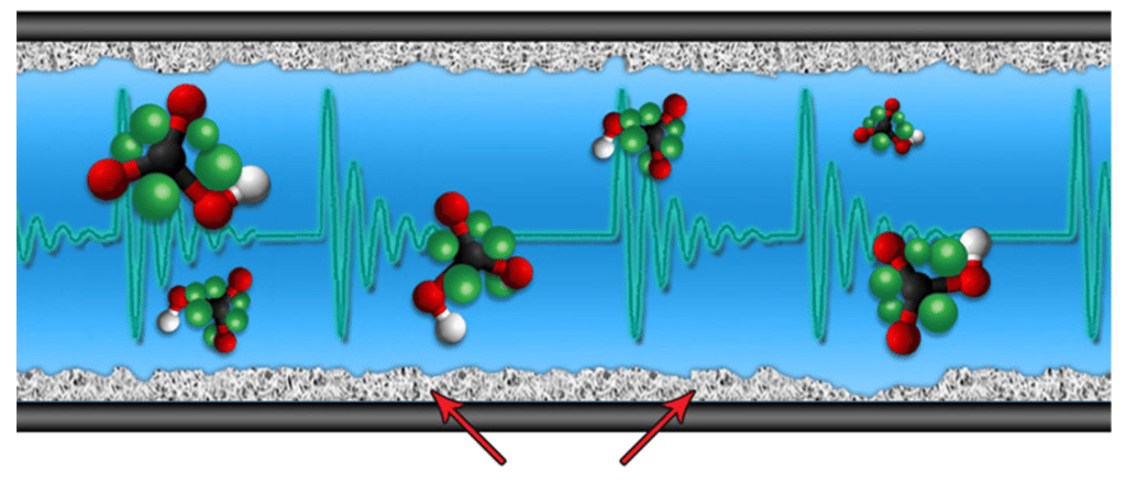 However, with Hydropath technology, when the clusters precipitate out of solution, they form stable calcite crystals that do not accumulate as hard scale. Since hard scale no longer accumulates, liquid flowing in the pipe contributes to the removal of existing scale deposits.