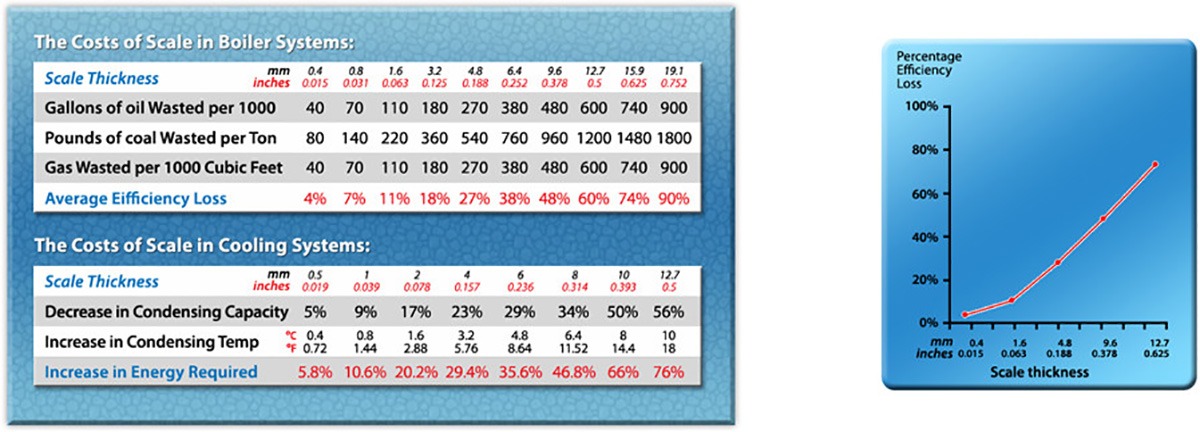 It’s important to understand that scale buildup in pipe systems, heating and cooling elements, and appliances come at a significant cost. First of all, it compromises energy-efficiency. In fact, in water heating and cooling systems, a quarter of an inch of scale buildup results in a 38 percent loss of efficiency - and that means your energy bills increase substantially.